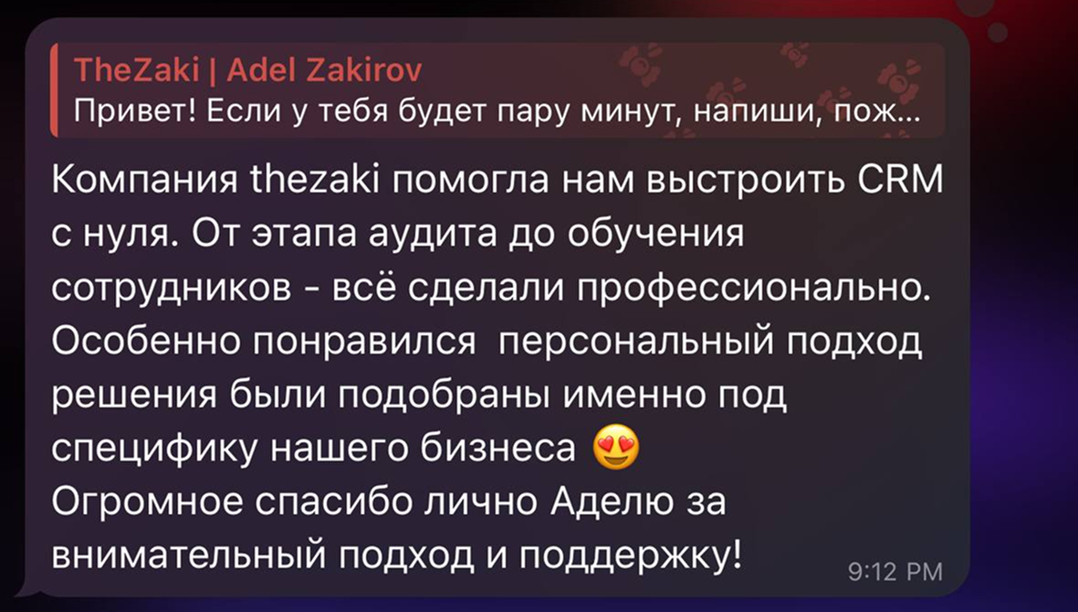 Официальный старт компании TheZaki. Создана собственная разработка для интеграции CRM с AI для автоматизации и аналитики.